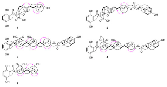 The 1H−1H COSY, Key HMBC and ROESY correlations for 1–4 and 7.