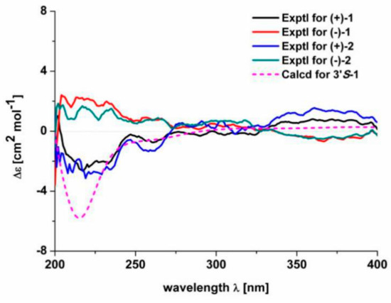 Compound 2 has a molecular formula of C30H32O9 deduced from its positive HRESIMS, 13C-NMR, and DEPT spectra. After careful analysis of the data of 1 and 2 (Table 1), it was found that the only difference between 2 and 1 is that a 4-hydroxycinnamic acid group is connected to C-12′ via an oxygen atom, this conclusion is supported by the HMBC correlation (Figure 2) of H2-12′ (δH 4.56)/C-9′′ (δC 169.1). The stereochemistry of 2 was assigned using ROSEY evidences. The ROESY correlation (Figure 2) of H2-9′ (δH 2.14)/H3-13′ (δH 1.68) indicate that the configuration of Δ10′(11′) double bond is E-form. The large coupling constants (nearly 16.0 Hz) of the one pair of olefinic protons suggest the trans form for the Δ7′’(8′′) double bond. Compound 2 was also isolated as a racemic mixture. Further separation by chiral phase HPLC afforded (−)-2 and (+)-2. To clarify their absolute configurations, ECD curve comparison with 1 was used. It is obvious that the experiment CD spectrum of (+)-2 agrees well with the experiment CD spectrum of (+)-1 (Figure 3). The absolute configurations of (−)-2 and (+)-2 were thus assigned as 3′R and 3′S, respectively. Ultimately, the (−)-2 and (+)-2 was determined to be (R)-2-(2-(2,5-dihydroxyphenyl)-2-oxoethyl)-6-((E)-5-(((E)-3-(4-hydroxyphenyl)acryloyl)oxy)-4-methylpent-3-en-1-yl)-2,3,4,7-tetrahydrooxepine-2-carboxylic acid and (S)-2-(2-(2,5-dihydroxyphenyl)-2-oxoethyl)-6-((E)-5-(((E)-3-(4-hydroxyphenyl)acryloyl)oxy)-4-methylpent-3-en-1-yl)-2,3,4,7-tetrahydrooxepine-2-carboxylic acid respectively. In this way, the structure of 2 was deduced and named zizhine Q.