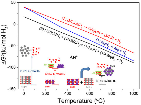 One of the most attractive destabilized hydride systems is the stoichiometric mixture MgH2:2LiBH4, or the so-called Li-RHC system (RHC: Reactive Hydride Composite). The destabilization concept refers to Reaction (1), through which the theoretical overall reaction enthalpy in standard conditions is notably reduced to 46 kJ mol−1 H2 in comparison with MgH2 (76 kJ mol−1 H2) and LiBH4 (67 kJ mol−1 H2; for decomposition to LiH, B, and H2) [28]. Destabilizing both hydrides by the RHC concept means the reduction of the reaction enthalpy by the exothermal formation of MgB2 upon dehydrogenation. Such a low enthalpy value leads to a dehydrogenation temperature of about 40 °C under 1 bar of H2, considering the entropy value of ~130 J mol−1 H2 K−1 for the change of hydrogen from the gas phase to the solid phase in a conventional metal-hydrogen system. Furthermore, Li-RHC has a theoretical hydrogen capacity of 11.4 wt.%. Figure 2 depicts the free energy per mol of H2 and the standard enthalpy of reaction per mol of H2 resulting from the mutual destabilization of LiBH4 and MgH2, calculated with HSC software [28].