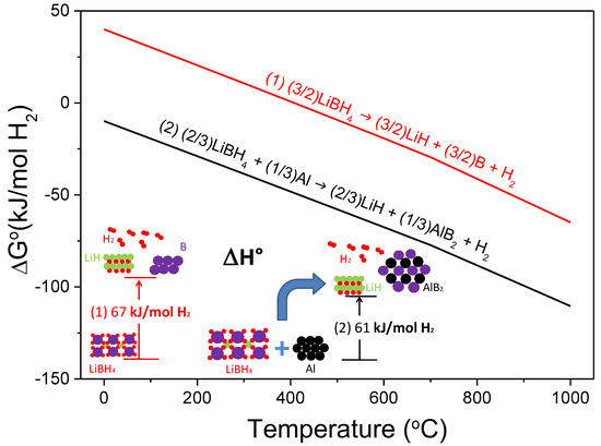 Interestingly, the value of the enthalpy for the dehydrogenation (Reaction (2)) has been controversially debated. Due to the uncertainty in the stability of the involved products, especially regarding AlB2 which calculated formation enthalpy varies from 23 to 151 kJ mol−1, different published reaction enthalpies can be found: ΔH = 18.8 kJ mol−1 H2 [71,74], ΔH = 44.2 kJ mol−1 H2 [70], ΔH = 59.3 kJ mol−1 H2 [75]. Nevertheless, experimental analyses showed that the Al-destabilizing effect on LiBH4 is smaller than the calculated [75]. The composite 2LiBH4–Al has been suggested to release hydrogen in two steps represented by Reactions (2) and (3):