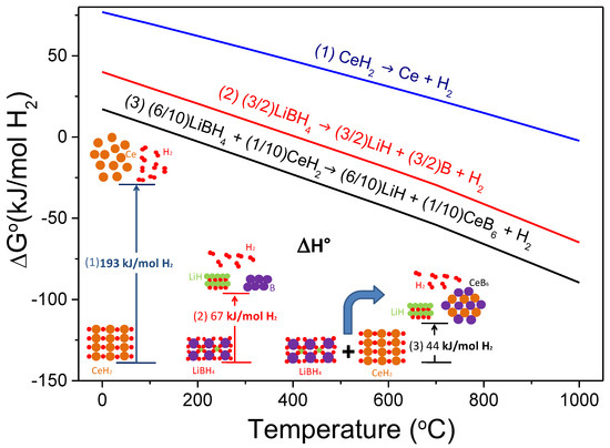 In the same year, Jin et al. were pioneers in successful destabilizing LiBH4 with CeH2 [83]. They assessed the theoretical enthalpy change of both LiBH4-Ce and LiBH4-CeH2 systems (27.6 and 44.1 kJ mol−1, respectively) and predicted a significant lower dissociation temperature than the individual hydrides (171 °C versus >350 °C [1]), according to Reaction (7). Experimental studies confirmed that the 6LiBH4-CeH2 composite catalyzed by 0.2TiCl3 release hydrogen at a temperature lower than LiBH4 melting forming CeB6 and LiH as solid products, in agreement with thermodynamic calculations. Figure 4 exhibits the free energy per mol of H2 and the standard enthalpy of reaction per mol of H2 resulting from the destabilized 6LiBH4 + CeH2 system according to Reaction (7), calculated with HSC software [28].
