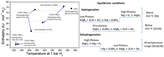 Table 1 summarizes the proposed reactions pathways for Li-RHC with different additives and at different temperature and pressure conditions. Based on this analysis, it is clear that the mutual destabilization effect between LiBH4 and MgH2 only occurs upon hydrogenation, but at relatively low temperatures (<413 °C) under equilibrium conditions. For the hydrogenation process carried out under dynamic conditions, the applied temperatures were usually in the range between 300 °C and 400 °C [33,34,35,36,37,38,56,57,58,59,60,61,62,63,64,65,66,67]; hence, the mutual destabilization effect was verified by a one-step curve of hydrogen uptake against time. However, for the dehydrogenation, the thermodynamics limits the behavior of Li-RHC to two main reaction steps, losing the benefit of the destabilization effect. Under dynamic conditions, the dehydrogenation process of Li-RHC is hugely dependent on the hydrogen backpressure owing to the formation of the MgB2, which makes possible the reversibility of the system at temperature and pressure conditions milder than those needed for the formation of LiBH4 from free B and LiH.