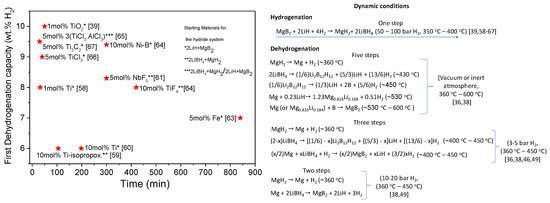 Table 2 provides a summary of some representative additives, describing hydrogenation and dehydrogenation conditions, capacities, and times as well as cycling stability (when it is available). As seen, the hydrogen capacities are between ~6 wt.% and ~10 wt.%, the temperature range is from 350 °C to 400 °C, the hydrogenation and dehydrogenation time range from 5 min to 4 h and from 30 min to 5 h, respectively, and the reported cycling covers up to 25 cycles with a measurable loss of capacity. Even though the hydrogen storage properties of Li-RHC were markedly improved, it is still a major constraint for a practical application that temperatures over 350 °C are required.
