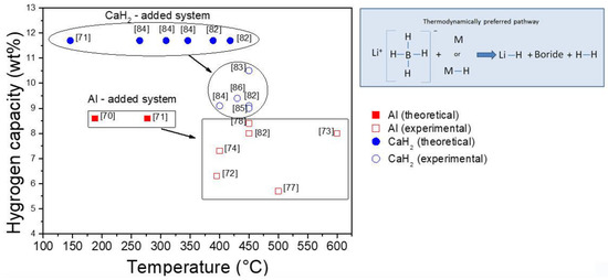 The formation of stable metal borides is expected as it represents the feasible thermodynamic pathway [71]. Despite this, the experimental evidence shows that metal or metal hydrides can be found as products [72]. For samples LiBH4-M (M = Cr, V, Sc, Ti) and LiBH4-MH2 (MH2 = TiH2), the observed desorption corresponds to the LiBH4 decomposition. In these cases, the M or MH2 starting material remains either unreacted (for Cr and TiH2) or, when thermodynamically favored, forms a stable hydride (for V, Sc, and Ti). Kinetic limitations can be related to reduced atomic diffusion of the additive metal, hydride, or boride species at temperatures at which the desorption reaction occurs. These additives do not destabilize LiBH4 thermodynamically, but they act as catalysts [72]. On the other hand, for samples LiBH4-M (M = Al, Mg) and LiBH4-MH2 (MH2 = CaH2, MgH2), the expected metal boride phases are formed (with high dependence from temperature and pressure conditions), validating the thermodynamically predicted reaction products [72,73]. In this section, the use of Mg and its hydride as destabilizing agents are not included as it has been presented previously, but the Al and CaH2 cases, which constitute light destabilization agents, are here analyzed.