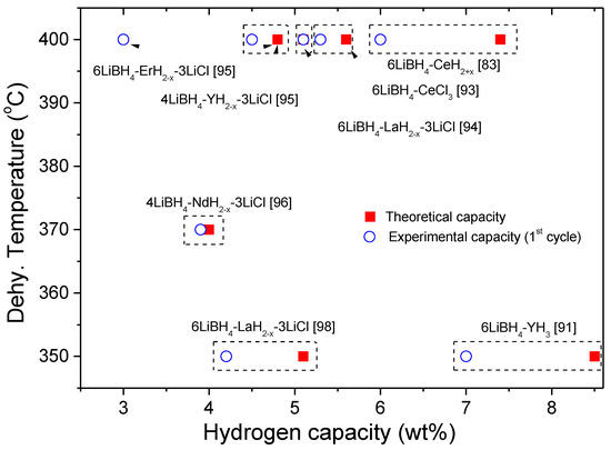 The relevance of the nanostructure of the LiBH4-CeH2+x composite on the hydrogen storage properties was showed in [94]. Superior sorption rates and hydrogen storage reversibility were reached when CeH2+x was formed in situ due to its nanostructured features. The addition of ZrCl4 forms Zr(BH4)4 in situ [108] and produces nanometric ZrB2, which increases the nucleation sites improving the dehydrogenation rate. Gennari reported for the first time the destabilized LiBH4-REH2 (RE = Ce, La) composite, where LaH2+x was produced by milling of the LaCl3 and LiH [86]. The onset temperature of hydrogen release was 260 °C, similar to LiBH4-CeH2+x composite. However, the LiBH4-LaH2+x system possesses inferior hydrogen storage reversibility than LiBH4-CeH2+x.