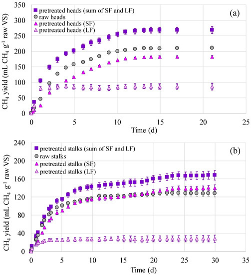 Figure 1. Biochemical methane potential (BMP) profiles of pretreated and untreated sunflower (a) heads and (b) stalks. Values correspond to means of triplicates of independent values ± standard deviations (error bars). SF: solid fraction, LF: liquid fraction.