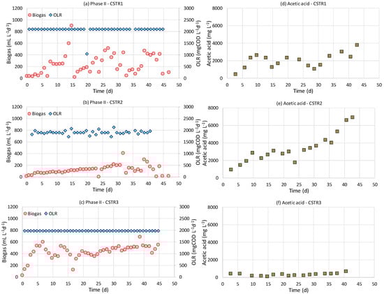 Figure 3. Biogas production rate compared to organic loading rate in three CSTRs fed on sunflower heads during operational phase II (a) CSTR1 (NaOH pretreated, 4% NaOH), (b) CSTR2 (NaOH pretreated, 8% NaOH), (c) CSTR3 (untreated) and acetic acid degradation profiles in (d) CSTR1, (e) CSTR2, (f) CSTR3.