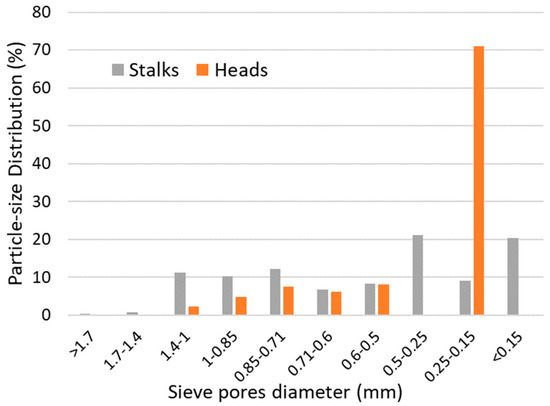 Figure 4. Graphical presentation of particle-size distribution of milled stalks and heads after sieving.