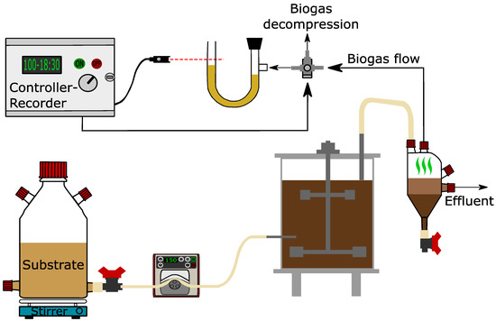 Experiments were conducted in three identical continuously stirred tank reactors (CSTRs) (Figure 5). Each CSTR had 3.2 L and 2.5 L total and working volume, respectively. All reactors were constructed from two Plexiglas cylinders concentrically configured to allow for the recirculation of hot water within the in-between void space, thus maintaining the digester’s temperature at 35 ± 1 °C through a controller. The CSTRs were mixed at ca. 85 rpm by a mechanical stirrer attached onto the top of the reactors. The biogas and the effluent were removed from the same tube (which determined the level of the mixed liquor in the CSTR) into a flask and they were separated. This flask allowed the solids to settle down while the supernatant overflowed through a port placed in the middle. The solids were removed daily from the bottom of the flask. Moreover, the biogas was released from the upper part of the flask and was led to a volumetric measurement device consisting of a U-tube filled with oil and a 3-way valve solenoid. The valve was activated by a level sensor which allowed for the displacement of oil by the biogas entering the U-tube and the release of biogas after the oil reached a certain level (Figure 5). The biogas production rate (BPR) is reported at STP [25].
