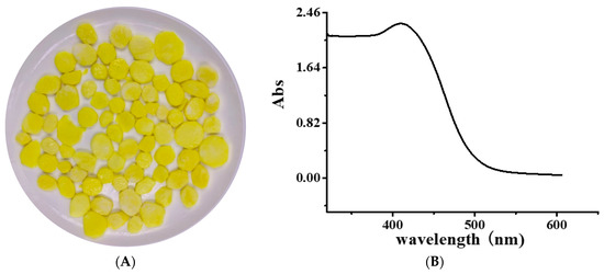 Yellow freshly cut yam (Figure 1A) and methanol were mixed in a 1:1 (m:v) ratio and soaked for 2 h. After filtration using filter paper, the methanol was removed by rotary evaporation. The resultant extract was separated by liquid chromatography using an Amberlite XAD-7 column (60 × 1.6 cm; Sigma, Santa Clara, CA, USA) on an AKTA explorer chromatography system (GE, Fairfield, CT, USA). The injection volume was 250 mL, and the column was washed with water (5 mL/min) to remove sugar and protein until electrical conductivity became stable. Subsequently, the pigment was eluted with methanol, and the eluent with an absorption peak at 410 nm was collected, concentrated by rotary evaporation (BUCHI R-215, Flawil, Switzerland), and then filtered using a 0.22 mm syringe filter.