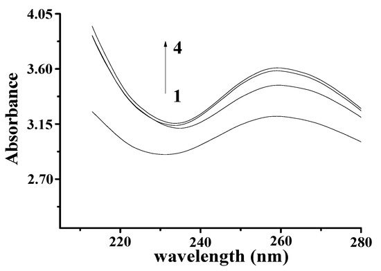 Absorption spectra of YP–DNA (CYP = 0.9 mg/mL, CDNA = 4 mg/mL) upon addition of increasing volume: (1) 0 μL, (2) 50 μL, (3) 60 μL, (4) 70 μL.