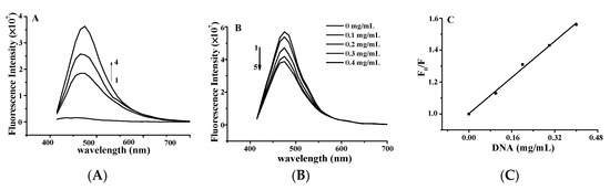 The effect of YP on the fluorescence spectrum of ctDNA is shown in Figure 3A. The fluorescence intensity of DNA increases when small molecules are intercalated into the nitrogenous bases of DNA [15,16]. The fluorescence intensity of DNA increased with increasing YP concentration, further confirming the binding between YP and DNA. Figure 3B shows the effect of DNA on the fluorescence spectrum of YP. YP exhibited a strong fluorescence emission peak at 475 nm under excitation at 380 nm, and intensity decreased gradually with increasing DNA concentration.