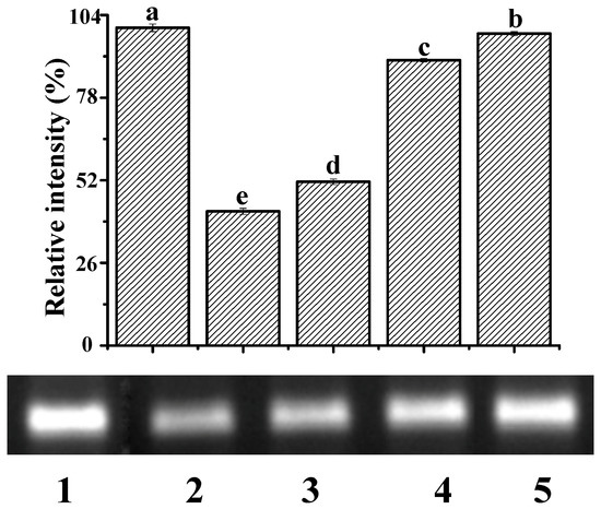 To study the protective effect of YP, DNA (0.15 mg/mL) was subjected to UV-induced hydroxyl radicals (∙OH) in the presence or absence of YP (0.05, 0.11, and 0.17 mg/mL) using the method of Li et al. [40], with modification. Hydrogen peroxide (H2O2; 50 μL; 1.5 × 10−2 mol·L−1) and DNA solution (100 μL) were mixed and irradiated with UV (130 Lux) in the presence or absence of YP for 2 min at room temperature. Resultant solutions (0.5 × TBE) were added to agarose gel (1%) containing goldview I of 0.4 μL at 55 °C. The volume ratio of sample solution to buffer solution was 4:2. The mixture (5 μL) was loaded onto a sample hole of 1% gel. Electrophoresis was conducted for approximately 30 min at 120 V (DYY-6C, Beijing Liuyi Co. Ltd., Beijing, China). DNA bands in the gel were imaged under a UV transilluminator [41].