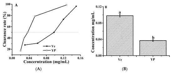 Hydroxyl radical scavenging activity of YP: (A) clearance rate as a function of YP or vitamin E (Ve) concentration and (B) IC50 values of YP and Ve.