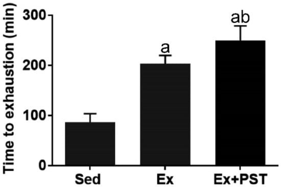 To examine the effect of PST supplementation and exercise training on endurance capacity in rats, we performed an endurance test at the end of the intervention. The exercise endurance was indicated by TTE. As shown in Figure 1, the TTE of the Ex group was significantly longer by 2.21-fold (p < 0.05) as compared with the Sed group, indicating that exercise training markedly enhanced endurance capacity. Compared to the Ex group, the TTE of the Ex + PST group was significantly longer by 1.30-fold (p < 0.05), suggesting that PST supplementation during exercise training period dramatically augmented the effect of exercise training on endurance capacity.