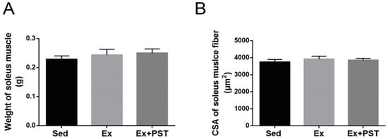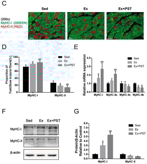 In this study, we first evaluated the changes in soleus muscle mass and the cross-sectional area (CSA) of soleus muscle fibers and there were no significant differences between these groups (p > 0.05, Figure 2A,B). Then, we analyzed the skeletal muscle fiber composition of the soleus muscle by immunofluorescence staining. The results showed that the proportion of slow-twitch fibers in the rats of the Ex group was higher than that of the Sed group, concomitant with a decrease in the proportion of fast-twitch fibers (p < 0.05, Figure 2C,D). Compared to the Ex group, the Ex + PST group has a higher proportion of slow-twitch fibers and a lower proportion of fast-twitch fibers (p < 0.05, Figure 2C,D). It demonstrates that exercise training induces fast-to-slow fiber type transition, and this effect could be amplified by PST treatment.