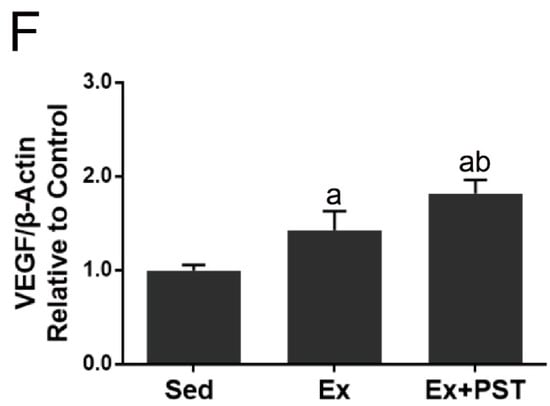 As VEGF is the most important regulator of angiogenesis, we next measured VEGF expression at the mRNA and protein levels in the soleus muscle. The results showed that the expressions of VEGF mRNA and protein in the soleus muscle of the Ex group were higher than that of the Sed group (p < 0.05), while the Ex + PST group had a much higher level of VEGF mRNA and protein than that of the Ex group (p < 0.05) (Figure 3D–F).