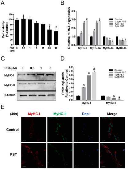 To verify the observed regulatory effect of PST on skeletal muscle fiber type composition in exercise-trained rats, we further investigated the effect of PST treatment on the expression of fiber type-specific MyHC isoforms in C2C12 myotubes in vitro. PST did not markedly affect the cell viability of C2C12 cells at concentrations below 10 μM (Figure 4A). As shown in Figure 4B, PST treatment significantly increased the expressions of MyHC-I and MyHC-IIa mRNA, and decreased the expressions of MyHC-IIx and MyHC-IIb mRNA (p < 0.05). The results of immunoblotting showed that the MyHC-I protein level was significantly increased, while the MyHC-II protein level was markedly decreased after treatment with PST (p < 0.05, Figure 4C,D). Furthermore, the effect of PST treatment on the expression of fiber type-specific MyHC isoforms in C2C12 myotubes was further confirmed by immunofluorescence staining (Figure 4E). Collectively, these results indicated that PST treatment could promote slow-twitch fiber formation in C2C12 myotubes.