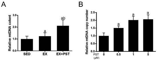 Effects of pterostilbene (PST) treatment on mitochondrial DNA copy number in muscle. Mitochondrial DNA copy number in the soleus (A) and C2C12 myotubes (B) were measured. Data are expressed as mean ± SD, a—p < 0.05 compared with the Sed group; b—p < 0.05 compared with the Ex group.