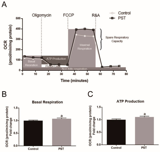 Mitochondrial function assay was performed using XFp Analyzer (Seahorse Bioscience, Agilent Technologies, Santa Clara, CA, USA). Briefly, C2C12 myoblasts were plated at a density of 14,000/well in an XFp 8-well plate. After differentiation and treatment with PST as mentioned before, C2C12 myotubes were cultured in a 37 °C non-CO2 incubator for 1 h with assay medium, which contained 10 mM glucose, 1 mM pyruvate, and 2 mM glutamine, and were adjusted to pH 7.4 at 37 °C. Components of the Cell Mito Stress Test (Agilent) were used to evaluate the mitochondrial function at the following final concentrations: 1.0 μM oligomycin, 3.0 μM FCCP, and 0.5/0.5 μM rotenone/antimycin A. The oxygen consumption rate (OCR) was measured according to the manufacturer’s instructions. After analysis, cellular protein levels in each well were measured by the Bradford method, and this value was used to normalize OCR.