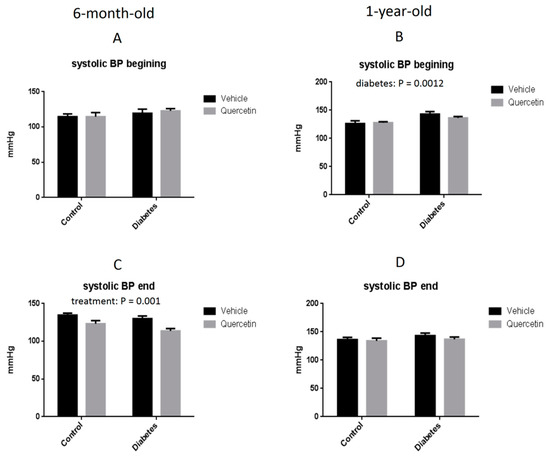 Systolic blood pressure (BP) measured by tail-cuff plethysmography in younger (A,C) and older (B,D) ZDF rats: BP beginning—measured before start of quercetin treatment (A,B); BP end—measured after the completion of quercetin treatment (end of week 6) (C,D). Results are expressed as means ± SEM. Significant differences were evaluated by two-way ANOVA for main factors diabetes and quercetin treatment.