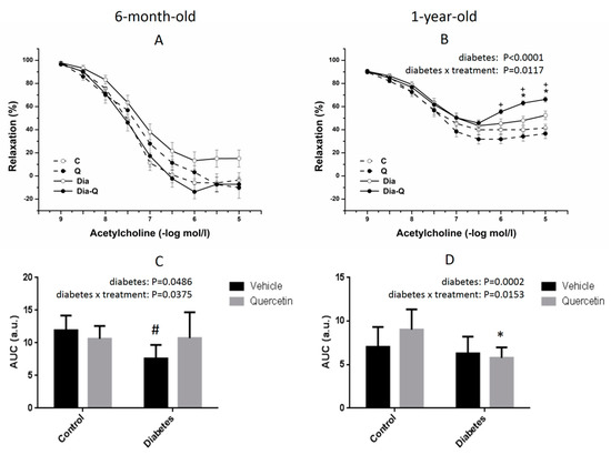 Maximal and overall relaxation of thoracic aorta: diabetes dependence. The endothelium-dependent vasorelaxant responses of thoracic aorta induced by acetylcholine in younger (A) and older (B) rats; and effect of treatment with quercetin on overall acetylcholine-induced relaxation of thoracic aorta in younger (C) and older (D) rats. AUC—area under the curve; a.u.—arbitrary units. Results are expressed as mean ± SEM. Significant differences were evaluated by two-way ANOVA for main factors diabetes and quercetin treatment (shown for maximal (A,B) and overall (C,D) relaxation). Tukey post hoc test was used to describe the differences in mean values of the experimental groups. # p < 0.05 vs. C; * p < 0.05 vs. Dia; + p < 0.05 vs. Q.
