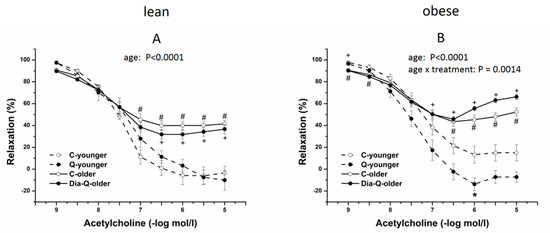 The endothelium-dependent vasorelaxant responses of thoracic aorta induced by acetylcholine in lean (A) and obese (B) rats. Results are expressed as mean ± SEM. Significant differences were evaluated by two-way ANOVA for main factors diabetes and quercetin treatment (shown for maximal relaxation). Tukey post hoc test was used to describe the differences in mean values of the experimental groups. # p < 0.05 vs. C-younger; +p < 0.05 vs. Q-younger.