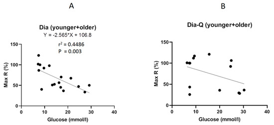 We also evaluated the relationship between plasma glucose level and maximal reached endothelium-dependent vasorelaxation. We confirmed that endothelial dysfunction negatively correlated with glucose level regardless of the age (r2 = 0.4486, p = 0.003; Figure 4A). On the other hand, the effect of QCT seems to be age-dependent because the maximum endothelium-dependent vasorelaxation was not affected by glycaemia (r2 = 0.1723, p = 0.14; Figure 4B).