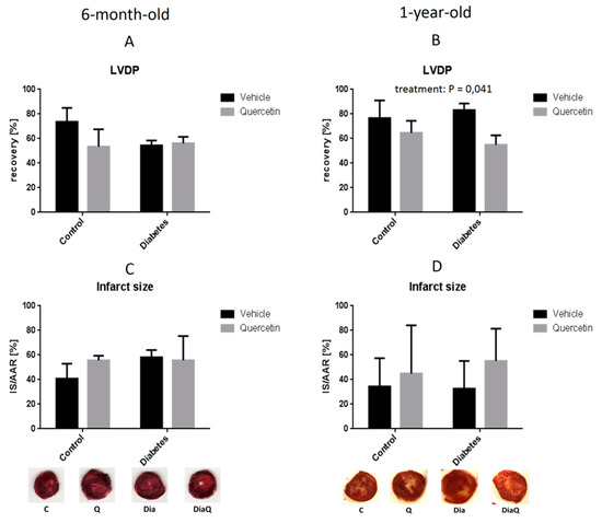 After ischemia (in the 40th minute of reperfusion), no significant differences were found in post-ischemic recovery of LVDP (Figure 5A), as well as in other hemodynamic parameters including +(dp/dt)max, −(dp/dt)max, RPP and coronary flow (data not shown) in the hearts from younger rats indicating no effect of either diabetes or QCT treatment on resistance of hearts to I/R. In addition, no significant differences in infarct size were found in the hearts from younger rats (Figure 5C). In older hearts, QCT treatment significantly decreased recovery of LVDP (p < 0.05), independently on presence of diabetes (Figure 5B) suggesting detrimental effect of QCT in older hearts. No significant differences were found in recovery of other hemodynamic parameters of older hearts including +(dp/dt)max, −(dp/dt)max, RPP and coronary flow (data not shown). Finally, infarct size was not influenced by QCT treatment in older rats (Figure 5D). These data indicate that QCT exerts no cardioprotection against I/R-induced development of myocardial infarction in ZDF rats.