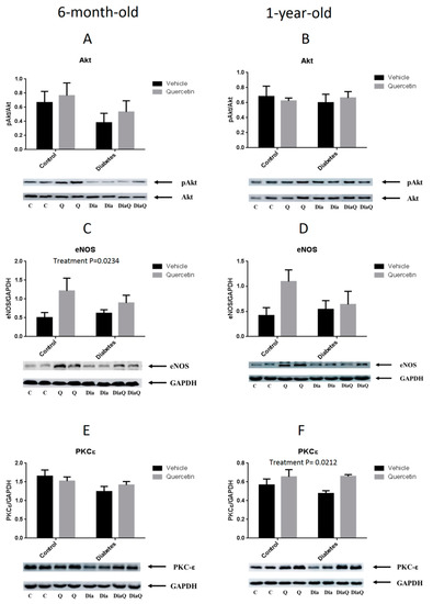 In younger (6-month-old) ZDF rats, no effect of either diabetes or QCT treatment on Akt kinase activation (expressed as a ratio of Akt kinase phosphorylated at Ser473 to total Akt kinase) was found (Figure 6A). Further, QCT treatment significantly up-regulated eNOS protein expression (p < 0.05), independently on the presence/absence of diabetes (Figure 6C). Finally, there were no differences in PKCε protein expression in 6-month-old rats (Figure 6E).