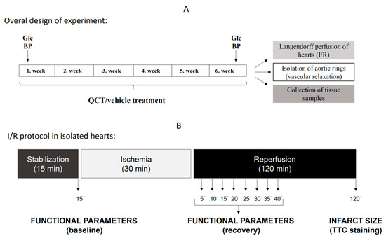 After the completion of QCT treatment, animals were anaesthetized with thiopental (50 mg/kg, i.p.) and heparinized (500 IU, s.c.); excised hearts were either perfused according to Langendorff and tested on I/R injury or used for tissue sample analyses. Isolated arteries were used either for vascular reactivity measurements or stored for further tissue analyses. Arterial blood taken from abdominal aortas before heart excision was collected in anticoagulant tubes (FL Medical, Torreglia (Padova), Italy); blood plasma obtained by centrifugation was stored for further analyses at −70 °C. All animal experiments were performed in accordance with the rules issued by the State Veterinary Administration of the Slovak Republic, legislation No 377/2012 and with the regulations of the Animal Research and Care Committee of Centre of Experimental Medicine SAS—Project no. 2237/18-221/3, approved on 21 August 2018.