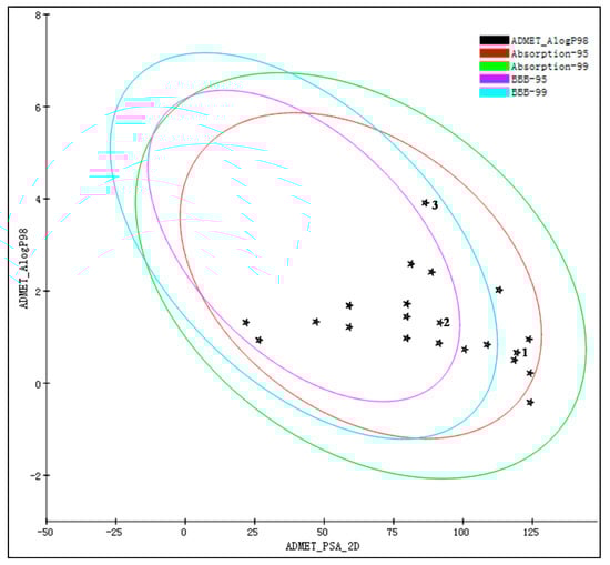 Next, the “ADME/T descriptors” (absorption, distribution, metabolism, excretion, and toxicity) and “toxicity prediction” modules were used to predict the pharmacokinetic and toxicity parameters of the 64 candidate molecules. We excluded molecules that are difficult for the intestine to absorb, easily penetrate the BBB, inhibit CYP2D6, have a high plasma protein binding rate, have poor water solubility, and are toxic (high probability of carcinogenicity and mutagenesis), leaving 23 candidate compounds [22]. The relationship between the two-dimensional polar surface area (PSA_2D) and the calculated value of AlogP98 for the 23 compounds is shown in Figure 1, with the HIA and BBB penetration model 95% and 99% confidence ellipses. Predicting the value of AlogP98 can determine the hydrophilicity of the compound. AlogP98 > 5 may be related to the absorption or permeability of the compound. PSA is another key attribute related to drug bioavailability, as compounds with PSA <140 Å2 can be passively absorbed and so have high oral bioavailability [23]. As shown in Figure 1, the 23 compounds all fell within these ranges.