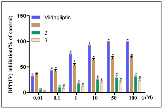 Inhibitory activity of compounds 1–3 and vildagliptin (at different doses) against DPP-IV. * p < 0.05 compared with the 0.01 μM group.