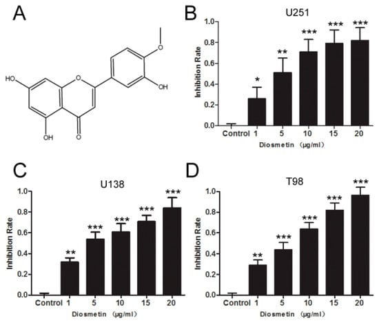 Diosmetin inhibited the proliferation of glioma cells. (A) The structure of diosmetin. MTT assay for the case of cell proliferation of (B) U251, (C) U183, and (D) T98; n = 6, and the data are presented as the mean ± standard deviation. Compared with the control group, * p < 0.05, ** p < 0.01, *** p < 0.001.