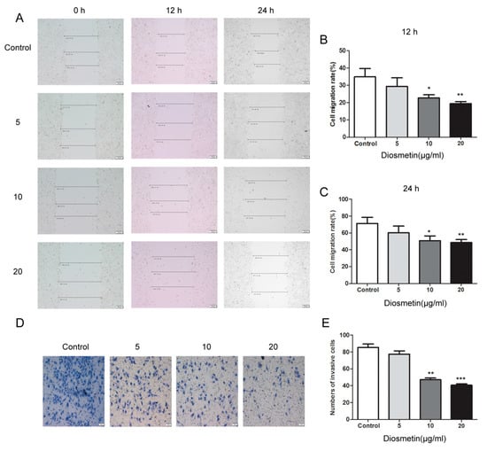 Diosmetin inhibited the invasion and migration of glioma cells. (A–C) Cell-scratching assays. (D,E) Transwell assays. Compared with group, * p < 0.05, ** p < 0.01, *** p < 0.001.