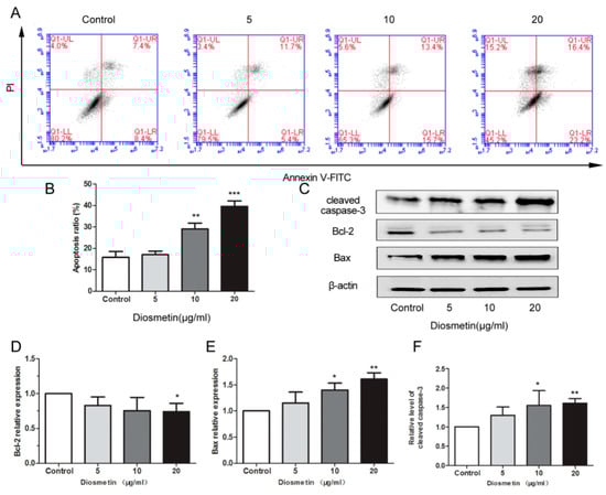 The results of flow cytometry showed that diosmetin significantly induced the apoptosis of U251 cells. The apoptosis ratio in the diosmetin 10 and 20 μg/mL groups was 0.98 and 2.54 times that in the control group, respectively (Figure 3A,B; p < 0.01, p < 0.001); thus, apoptosis in the diosmetin group was increased compared with that in the control group. To elucidate the effect of diosmetin on the U251 cells, the levels of Bcl-2, Bax, and cleaved caspase-3 in different treatment groups were determined. The result indicated that the expression of Bcl-2 in the diosmetin 20 μg/mL group was only 71% of that in the control group (Figure 3C,D; p < 0.001), while that of cleaved caspase-3 and Bax was 1.58 (Figure 3C,E; p < 0.01) and 1.63 (Figure 3C,F; p < 0.01) times that of the control group, which indicates that diosmetin can induce the apoptosis of U251 cells.
