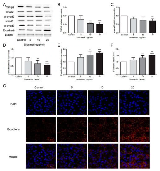 Diosmetin led to inhibition of the TGF-β signaling pathway and activation of E-cadherin expression in glioma cells. Western blot assay was performed to detect the protein levels of (A,B) TGF-β1, (A,C) p-smad2, (A,D) p-smad3 and (A,E) E-cadherin, with the grayscale analysis using β-actin as the internal control. (F) Real-time PCR was used to detect the expression level of E-cadherin mRNA. (G) Immunofluorescence staining was performed to observe the distribution of E-cadherin protein in glioma cells. Compared with control group, * p < 0.05, ** p < 0.01, *** p < 0.001.