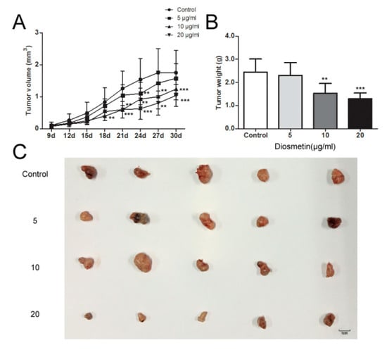 Diosmetin inhibited glioma tumor growth in vivo. (A) Tumor volume assay, (B) tumor weight assay, and (C) the photo of the tumor tissue. This figure shows the typical result of repeated experiments, and the data are presented as the mean ± standard deviation. Compared with the control group, ** p < 0.01, *** p < 0.001.