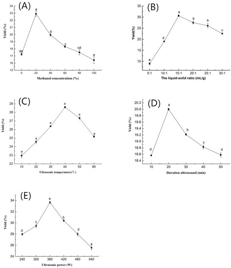 Effects of five factors on kinsenoside yield. (A) Effects of methanol concentration. (B) Effects of the liquid-solid ratio. (C) Effects of ultrasonic temperature. (D) Effects of the duration of ultrasound. (E) Effects of ultrasonic power. Note: Different letters in the figures indicate significant difference at 0.05 level.