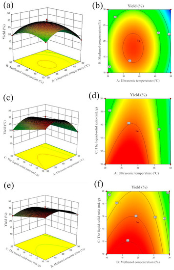Contour map and response surface plot. (a,b) Interaction plot of ultrasonic temperature and methanol concentration (the liquid-solid ratio is constant at 15:1 mL/g). (c,d) Interaction plot of ultrasonic temperature and the liquid-solid ratio (the methanol concentration is constant at 20%). (e,f) Interaction plot of methanol concentration and the liquid-solid ratio (the ultrasonic temperature is constant at 40 °C).
