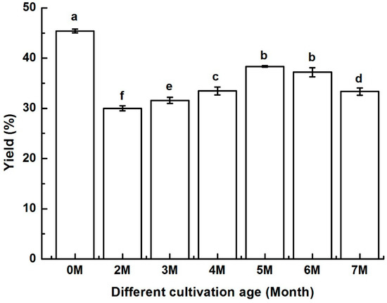 Kinsenoside yield in A. roxburghii at different cultivation ages. Note: Different letters in the figures indicate significant difference at 0.05 level.