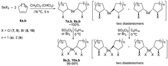- Potapov, V.A.; Amosova, S.V.; Volkova, K.A.; Penzik, M.V.; Albanov, A.I. Reactions of selenium dichloride and dibromide with divinyl selenide: Synthesis of novel selenium heterocycles and rearrangement of 2,6-dihalo-1,4-diselenanes. Tetrahedron Lett. 2010, 51, 89–92. [Google Scholar] [CrossRef]