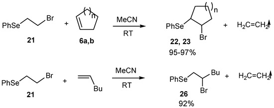 - Musalov, M.V.; Musalova, M.V.; Potapov, V.A.; Albanov, A.I.; Amosova, S.V. Methoxyselenation of Cyclopentene with Selenium Dibromide. Russ. J. Org. Chem. 2015, 51, 1662–1663. [Google Scholar] [CrossRef]