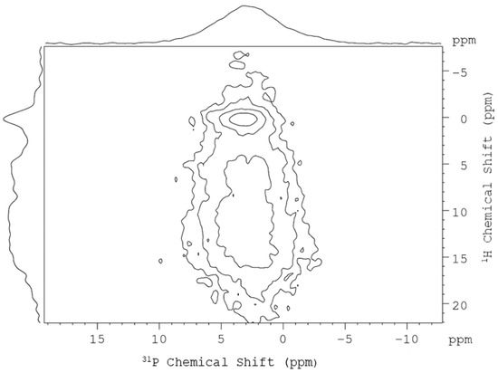 In general, the resolution of one-dimensional 31P NMR spectroscopy is not good enough to resolve the signals of the various phosphorus species present in dentin or bone. Fortunately, heteronuclear correlation (HETCOR), a two-dimensional method, is well suited to probe phosphorus species in close proximity to hydrogen, such as HAp and ACP [6,15]. In particular, it has been shown that the Lee–Goldburg cross-polarization (LG-CP) technique can be used to achieve polarization transfer with efficient suppression of 1H–1H spin diffusion [16,17]. A typical HETCOR spectrum acquired for Rx is shown in Figure 3, in which the signals of HAp and the disordered phase were well resolved. To avoid ambiguity, the disordered phase of dentin is referred to as dentin-ACP in our subsequent discussion. The correlation peaks at 0.2 ppm (1H) and 3.2 ppm (31P) were readily assigned to the HAp component. On the other hand, the dentin-ACP component had a relatively large chemical shift distribution in the 1H dimension (5 to 15 ppm), which indicated that dentin-ACP contained both orthophosphate and hydrogen phosphate ions. The intensities of the CP signals can be empirically described by the following equation: