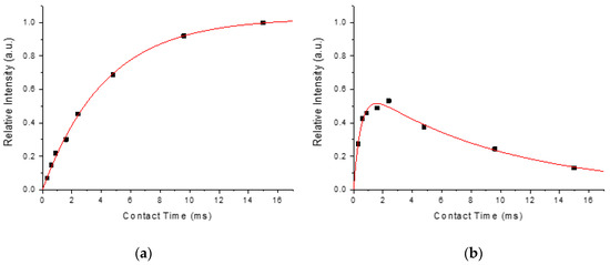 Modulation of the signals of the 31P{1H} LG-CP HETCOR spectra at variable contact times for the R21 sample. The profiles were fitted on the basis of Equation (1), from which the parameters of M0, τCP, and T1ρ were extracted. (a) HAp; (b) dentin-amorphous calcium phosphate (ACP).