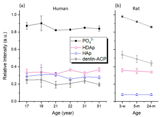 Distribution of the amounts of different phosphorus species normalized on the basis of the sample mineral content. (a) Results obtained for human dentin; (b) results for rat dentin taken from the literature [8].