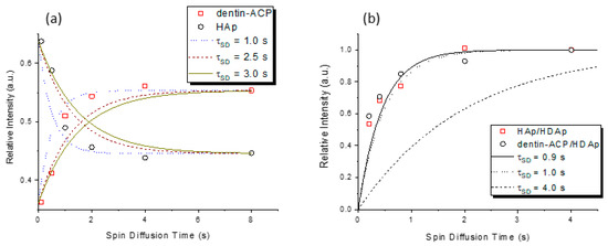 To investigate the relative proximity of the domains of different phosphorus species, one could exploit homonuclear 31P dipolar spin diffusion [11,18]. The relevant pulse sequences and an illustration of the spectrum are shown in Figures S4 and S5. The profiles of the spin diffusion experiments are shown in Figure 6. Accordingly, the correlation times characterizing the 31P spin diffusion process between any two domains of HAp, HDAp, and dentin-ACP were identical within experimental error. This is in stark contrast to the results for rat dentin, for which the correlation time between HAp and dentin-ACP was found to be significantly larger than the other correlation times [11]. Apparently, the structural model proposed for rat dentin, where the HAp core surrounded by the HDAp shell apatite crystallites is embedded in an amorphous calcium phosphate matrix, is not applicable to human dentin.