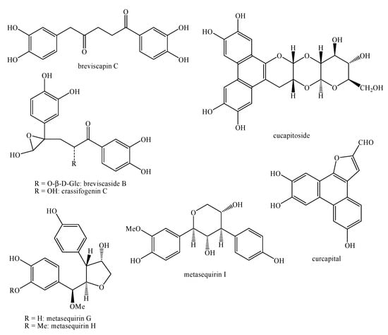 Vitexdoin F, vitedoin A, 6-hydroxy-4-(4-hydroxy-3-methoxyphenyl)-3-hydroxymethyl-7-methoxy-3,4-dihydro-2-naphthaldehyde, vitexdoin A, negundin B, vitexdoin E, vitrofolal F, 1,2-dihydro-7-hydroxy-1-(4-hydroxy-3-methoxyphenyl)-3-(hydroxymethyl)-6-methoxy-(1S,2R)-2-naphthalenecarboxaldehyde, vitexdoin C, vitexdoin D, vitrofolal E, vitexdoin B, vitrofolal A and detetrahydro-conidendrin (Figure 20) showed stronger effects than ascorbic acid [,].