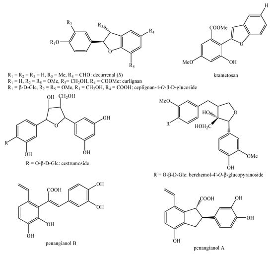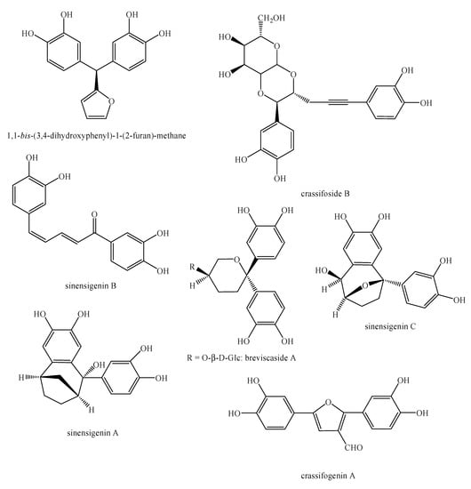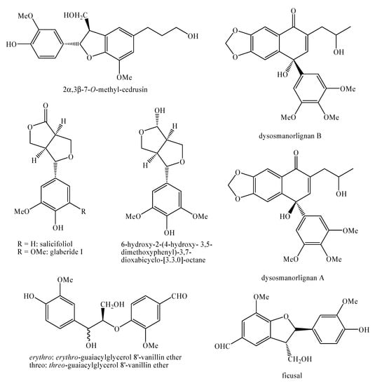 - D’Abrosca, B.; Dellagreca, M.; Fiorentino, A.; Golino, A.; Minaco, P.; Zarrelli, A. Isolation and Characterization of New Lignans from the Leaves of Cestrum parqui. Nat. Prod. Res. 2006, 20, 293–298. [Google Scholar] [CrossRef]