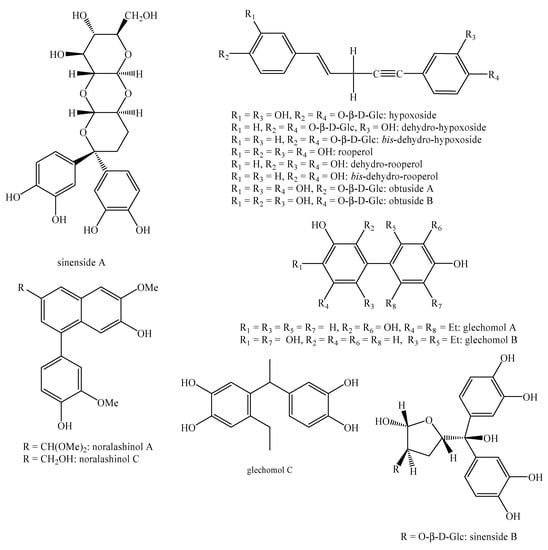 - Sibanda, S.; Ntabeni, O.; Nicoletti, M.; Galeffi, C. Nyasol and 1,3(5)-diphenyl-1-pentene Related Glycosides from Hypoxis angustifolia. Biochem. Syst. Ecol. 1990, 18, 481–483. [Google Scholar] [CrossRef]